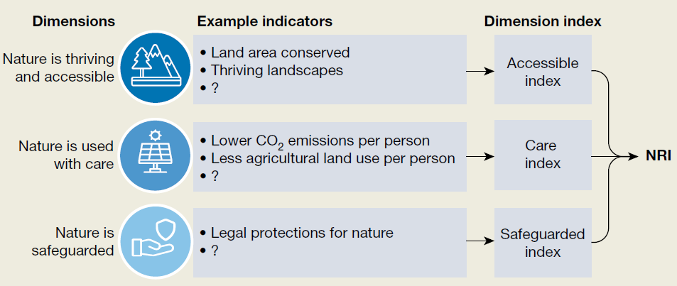 研究提出了一个崭新的全球性指标,“自然关系指数”(Nature Relationship IndexNRI),用于衡量一个国家或区域人与自然关系的质量,从而与人类发展指数互补。其目的是追踪和评估各国在改善人类与自然关系方面的进展。该指数包括:(1)拥有繁荣且可亲近的自然环境、(2)负责任地利用和呵护自然以及(3)保护自然的法规及效应等3大核心维度及可衡量的进展目标(见图1)。