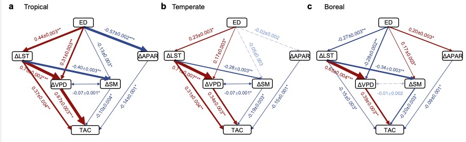 为厘清这一科学问题,研究团队基于多源卫星遥感数据,首次在全球范围内揭示了森林破碎化对生态系统恢复力的影响格局及机制。研究结果表明,全球约77%的破碎化森林中,破碎化指数与恢复力存在显著的统计学关联(P < 0.05),但其影响方向与强度在不同生物群落间差异显著。这种分异主要受生物物理过程的调控:在热带和温带森林生态系统中,破碎化通过加剧局地增温与大气干旱化,导致恢复力下降;而在北方森林中,破碎化反而会有利于增加大气湿度和优化光照资源,从而增强生态系统的恢复能力。