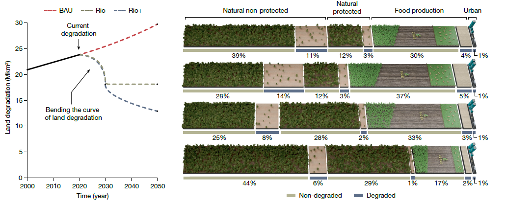 中国科学院生态环境研究中心区域与城市生态安全全国重点实验室傅伯杰院士参与的由沙特阿卜杜拉国王科技大学(KAUST)Fernando T. Maestre教授领衔、联合国防治荒漠化公约(UNCCD)首席科学家Barron J. Orr等21位科学家组成的国际团队,于2025年8月14日在国际顶级期刊《Nature》上发表题为《扭转土地退化曲线以实现全球环境目标》(Bending the curve of land degradation to achieve global environmental goals)的论文,提出以“重塑全球食物系统”为核心抓手,到2050年同时实现“遏制土地退化”和“恢复50%已退化土地”及“减少土地温室气体排放”的路线图。