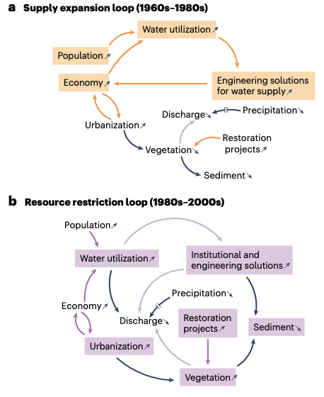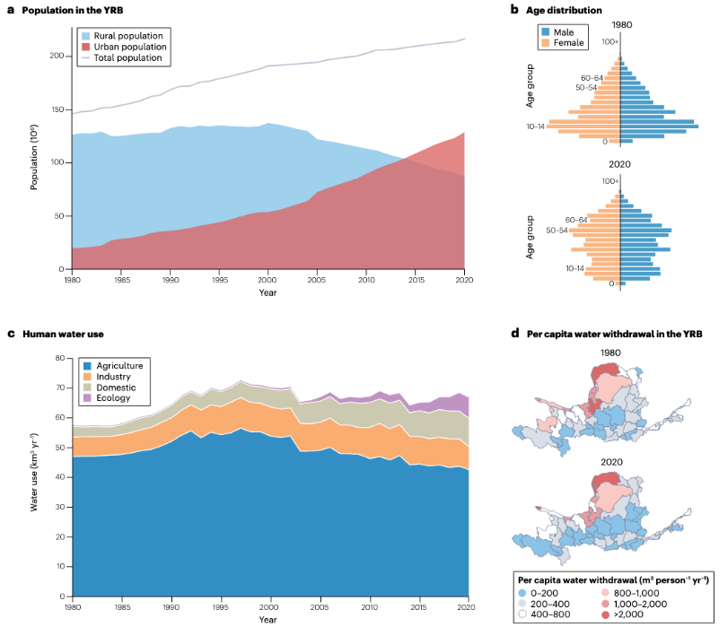 黄河流域水少、沙多、受人类活动影响强烈,人水关系及其互馈机制是流域生态保护和高质量发展的关键。2025年9月16日,傅伯杰院士团队在国际知名期刊《自然综述:地球与环境》(Nature Reviews Earth & Environment)发文,对20世纪50年代以来人类活动对黄河流域水循环和泥沙过程的影响进行了系统评述,揭示了人口、经济、工程、政策、水沙与生态间的互馈关系与耦合效应。研究指出黄河流域输沙量显著下降、水资源短缺加剧、人水关系显著改变,可持续发展面临着垂向水循环通量持续增大、自然水资源存量不断减少、局部功能性断流仍然存在、政策影响机制分析不足等挑战,在厘清人水互馈回路结构及演变的基础上提出了流域可持续管理策略。